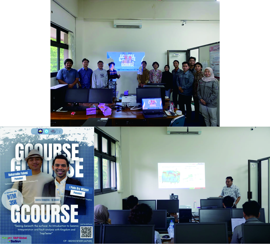 Pada tanggal 4–7 November 2025, Himpunan Mahasiswa Teknik Geofiska UPN"Veteran" Yogyakarta, SPWLA UPN SC, dan HAGI UPN SC menyelenggarakan G-Course dengan topik “Seeing Beneath the Surface: An Introduction to Seismic Interpretation and Fault Analysis with Kingdom and TrapTester.” Kegiatan ini bertujuan untuk memberikan pemahaman komprehensif mengenai dasar-dasar interpretasi seismik serta teknik analisis sesar menggunakan dua perangkat lunak industri yang umum digunakan, yaitu Kingdom dan TrapTester. Melalui pemaparan materi, demonstrasi workflow, dan sesi diskusi interaktif, peserta memperoleh wawasan tentang bagaimana data seismik dapat dimanfaatkan untuk mengidentifikasi struktur bawah permukaan , memetakan geometri sesar dengan Software Kingdom dan menganalisis bagaimana Fault/Seal dari patahan dengan menggunakan Software TrapTester. Kegiatan ini diharapkan dapat meningkatkan kompetensi teknis peserta dan memperluas kemampuan mereka dalam melakukan interpretasi data bawah permukaan secara lebih profesional dan terintegrasi.